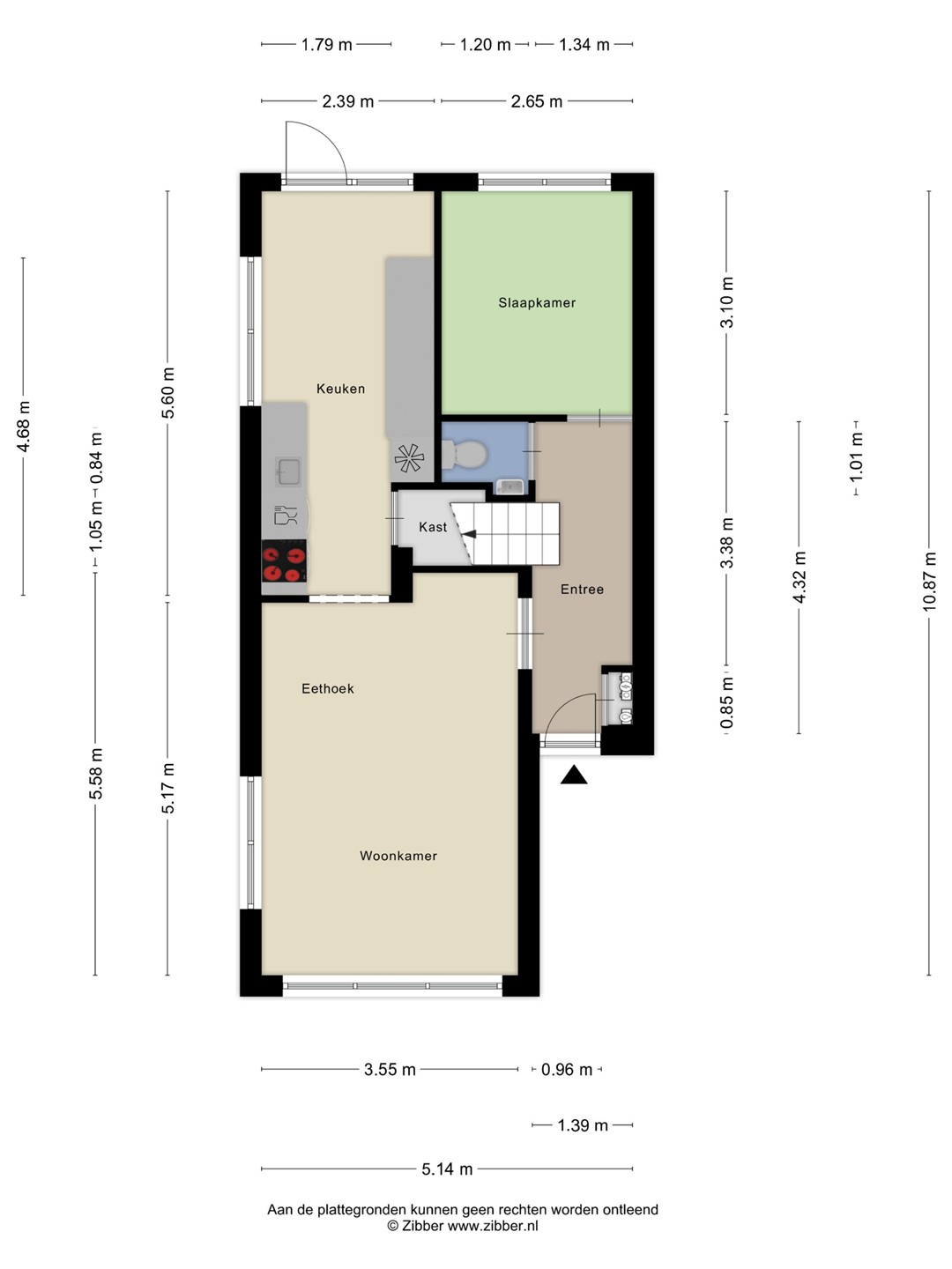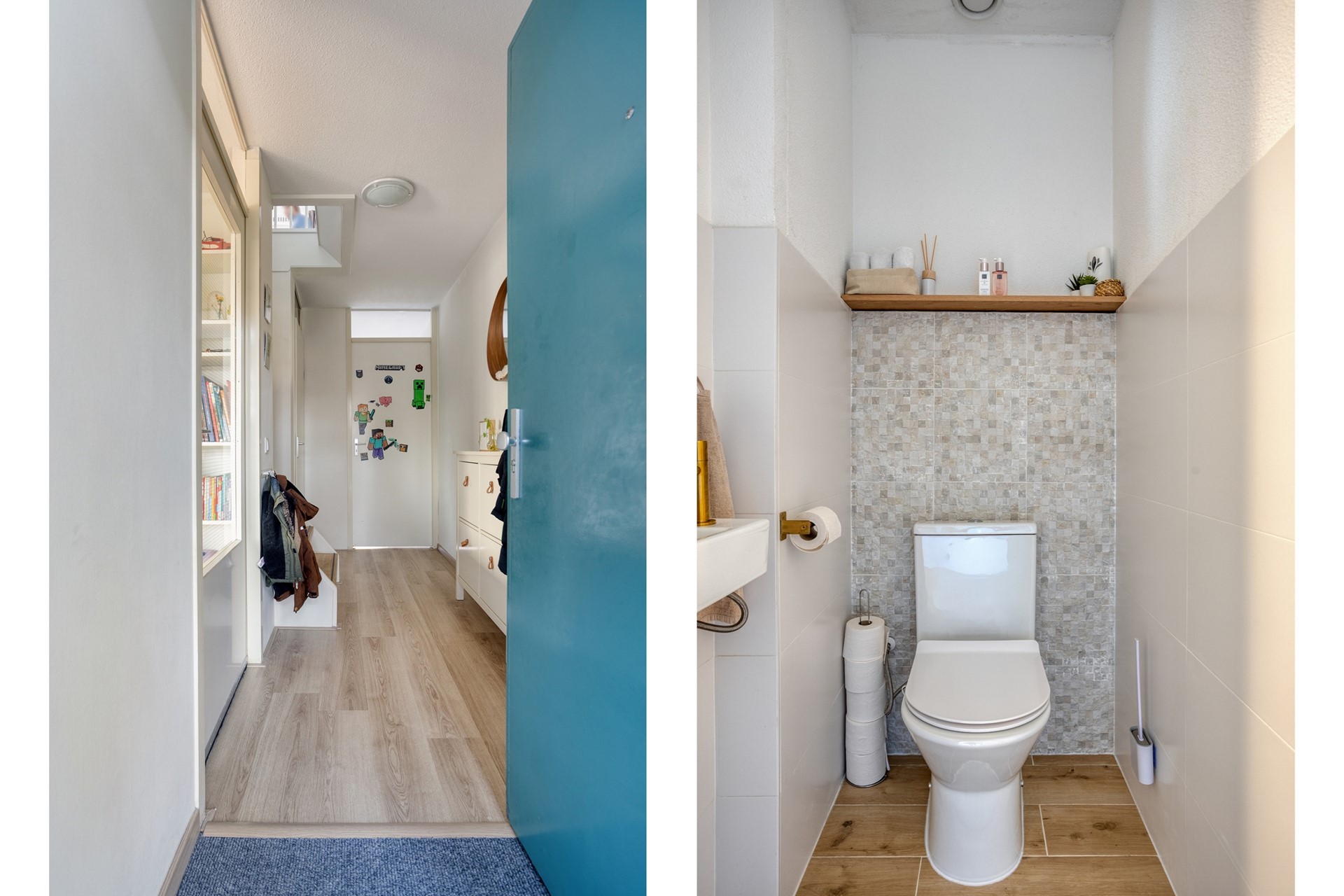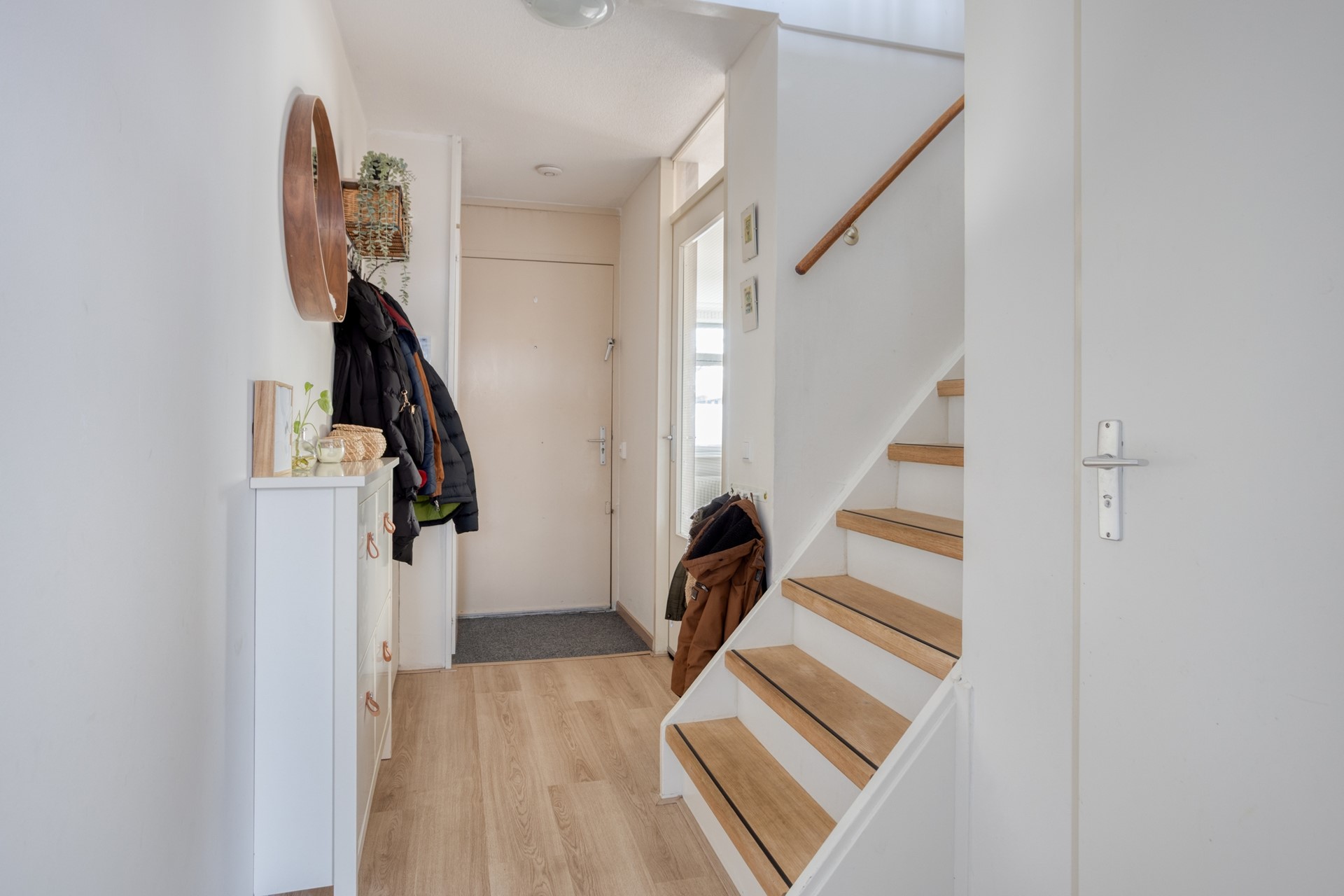 Entree met hal en trapopgang naar de verdieping. Vanuit de hal is er toegang tot het toilet en de woonkamer.