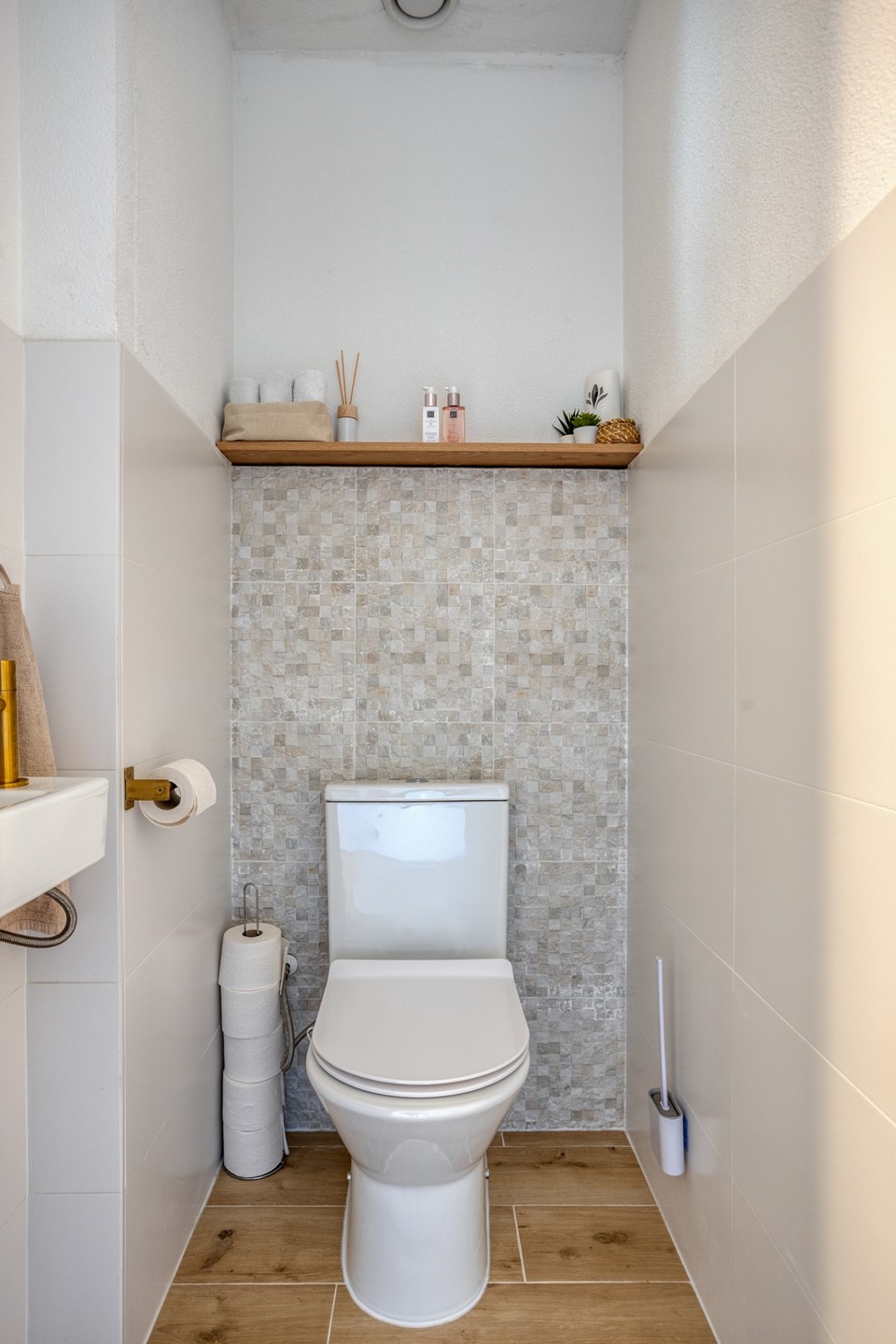 De badkamer is modern afgewerkt en voorzien van een inloopdouche, wastafelmeubel en toilet.