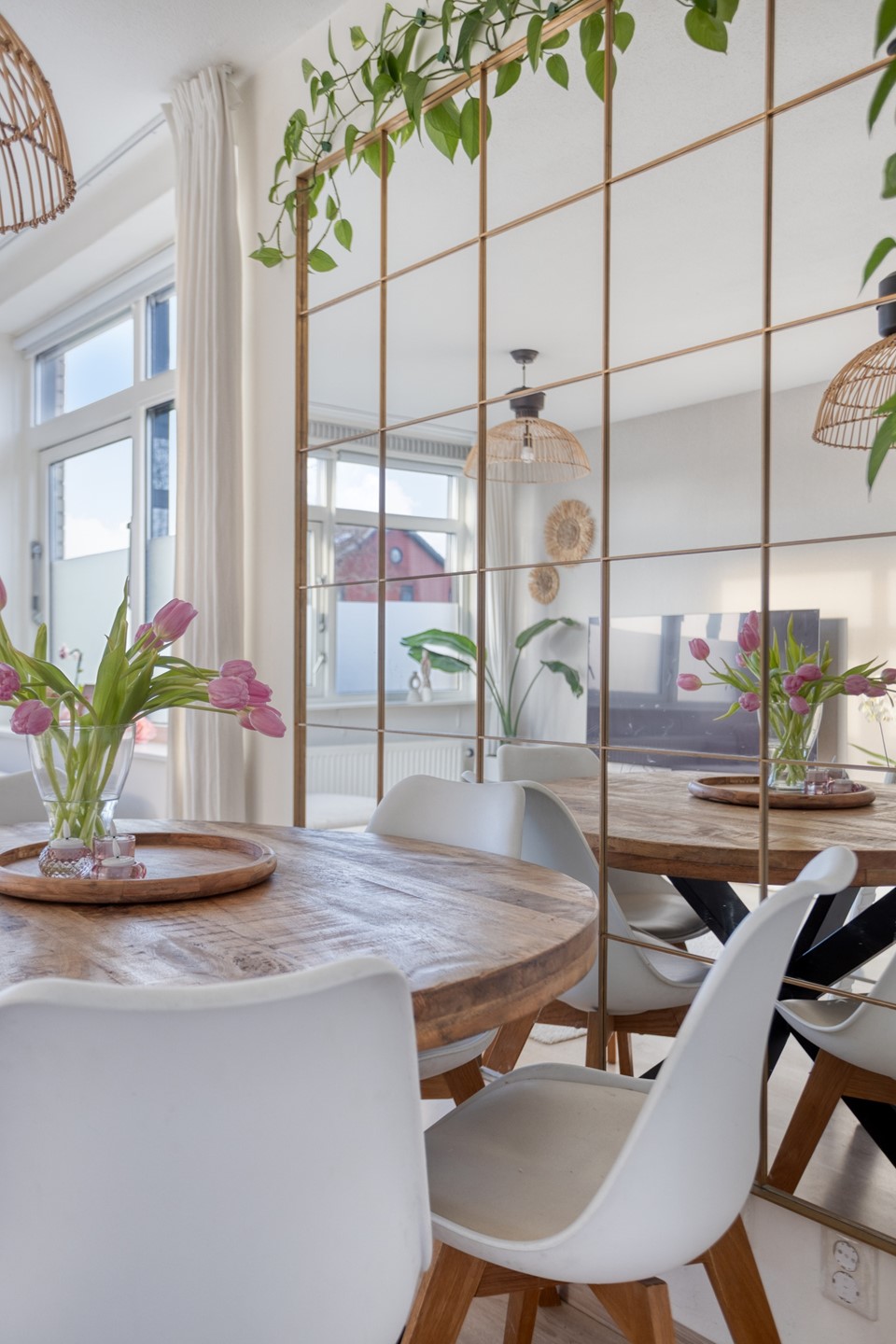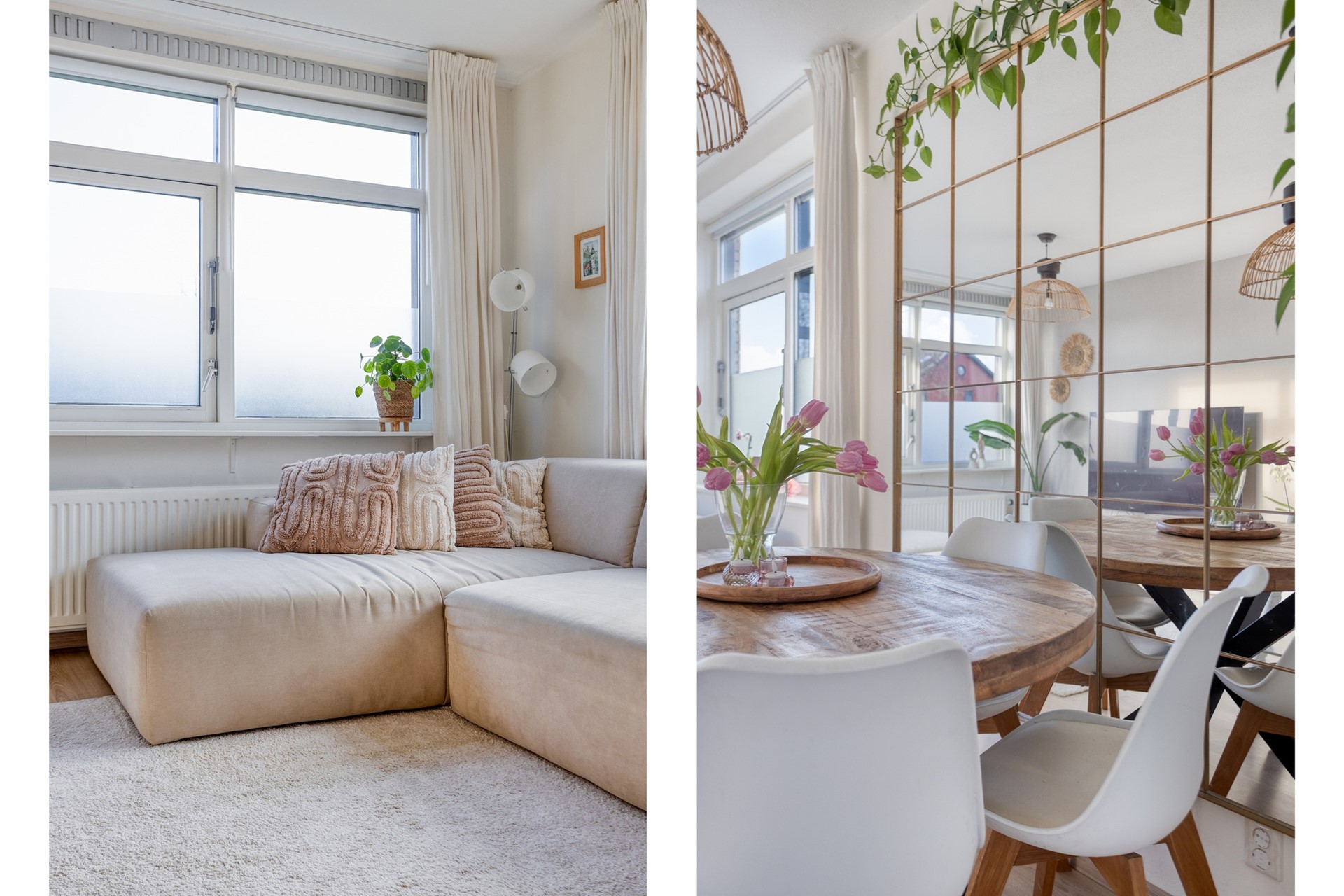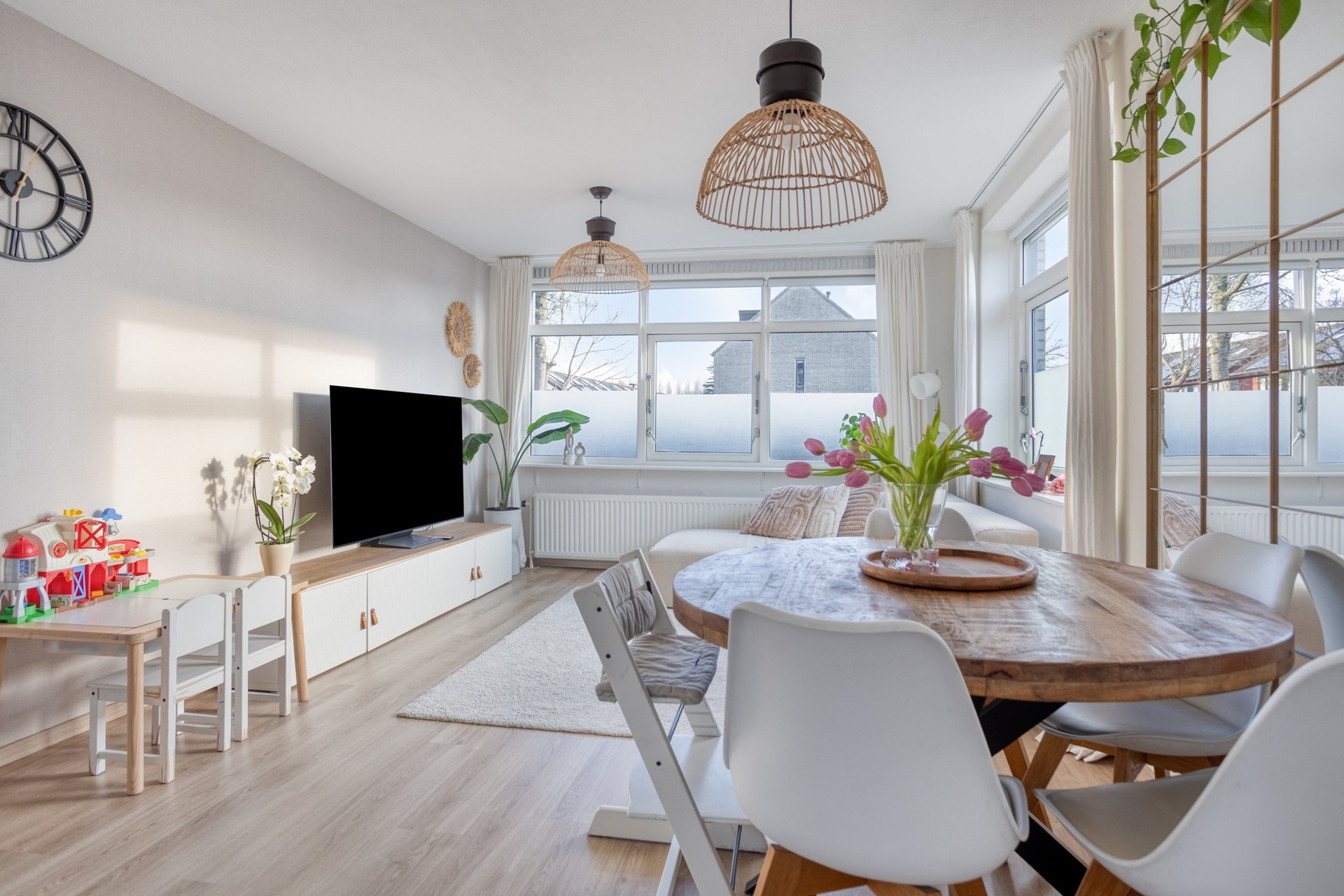 De lichte woonkamer bevindt zich aan de tuinzijde en biedt voldoende ruimte voor een comfortabele zithoek. Aansluitend ligt de eetkamer, die in open verbinding staat met de keuken.