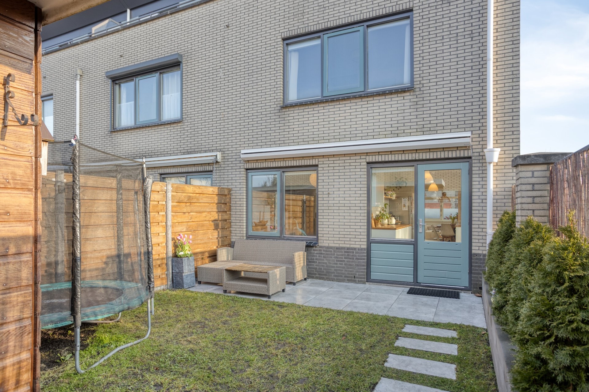 De achtertuin is verzorgd aangelegd.