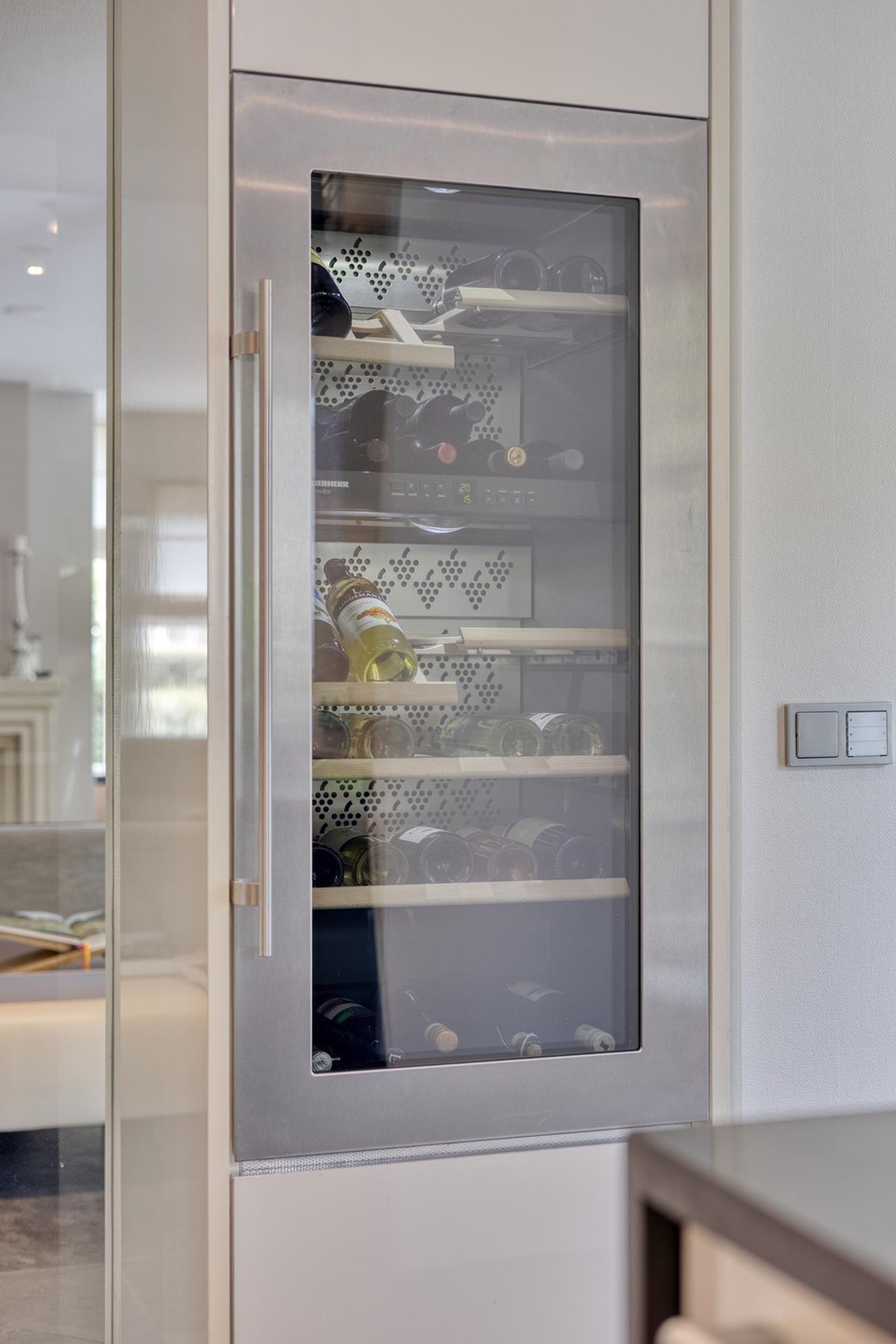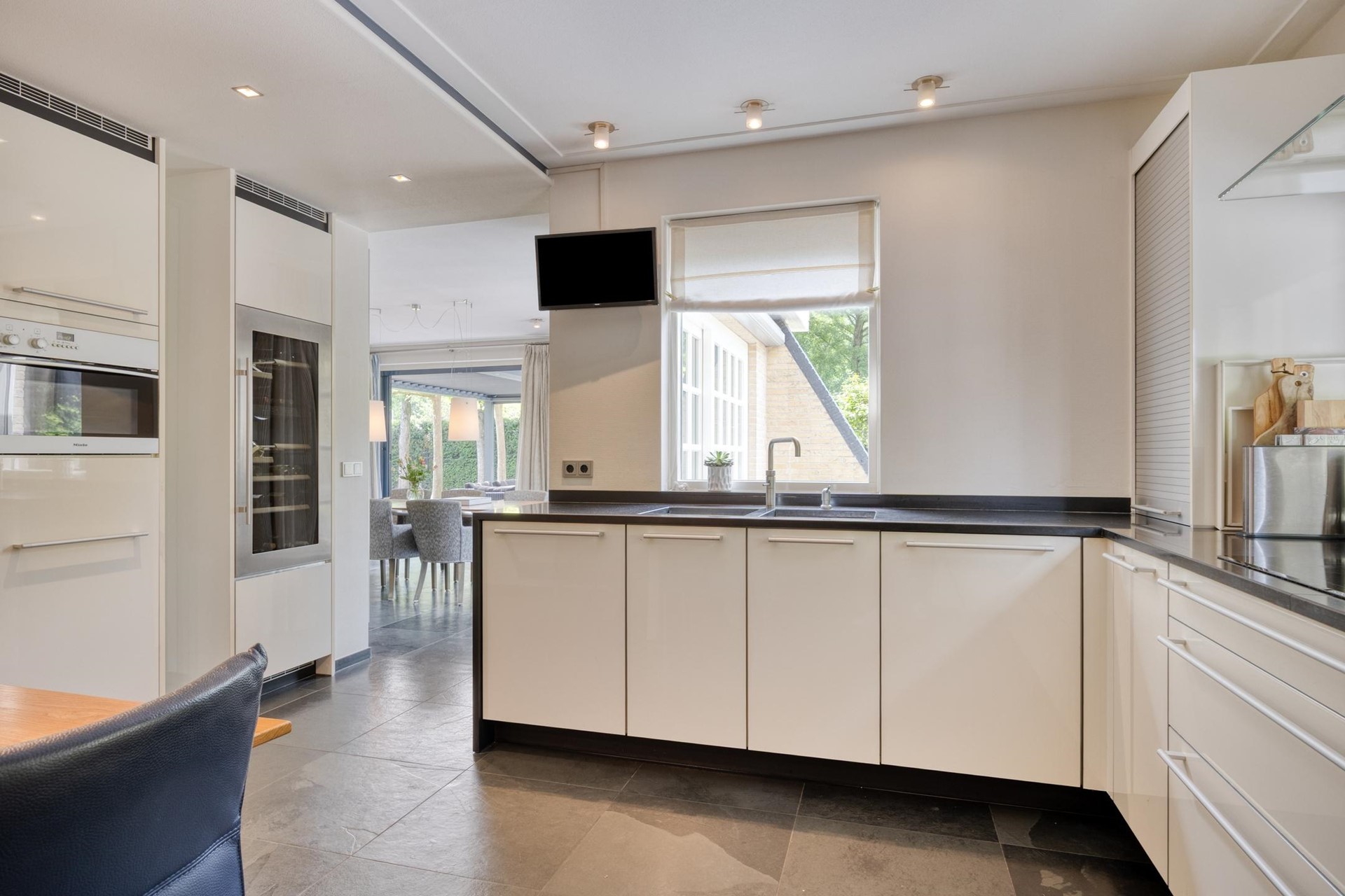 De lichte woonkamer, voorzien van een erker, gashaard en openslaande deuren naar het terras, vormt het hart van het huis. Aangrenzend bevindt zich de moderne keuken met hoogwaardige inbouwapparatuur, waaronder een wijnkast, en toegang tot een praktische voorraadkelder. Vanuit de keuken bereikt u de bijkeuken met witgoedaansluitingen en tuinontsluiting.