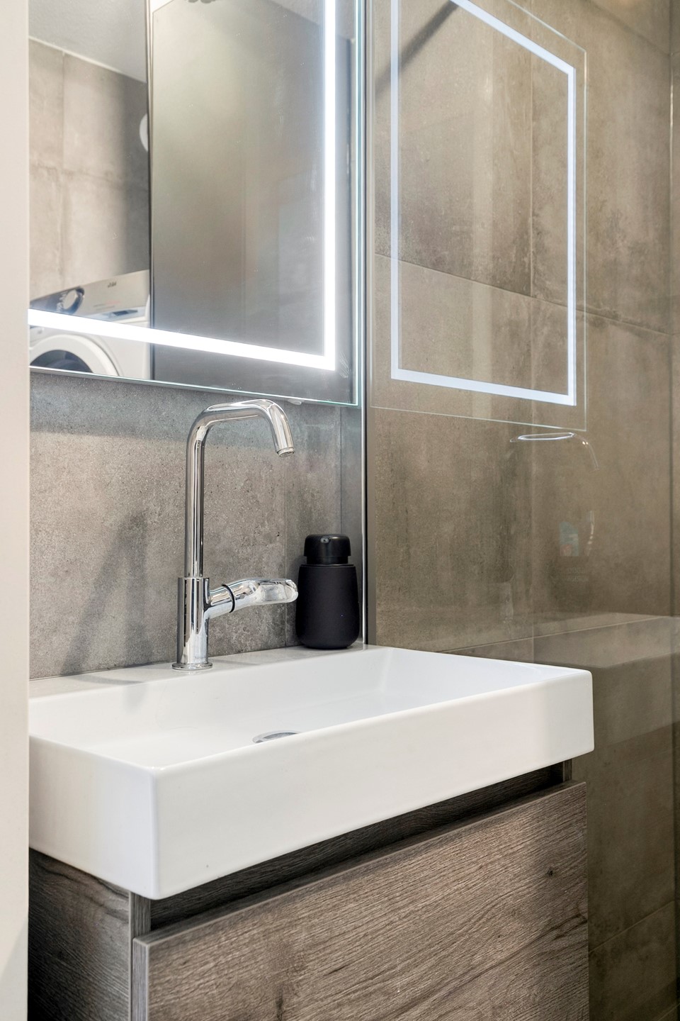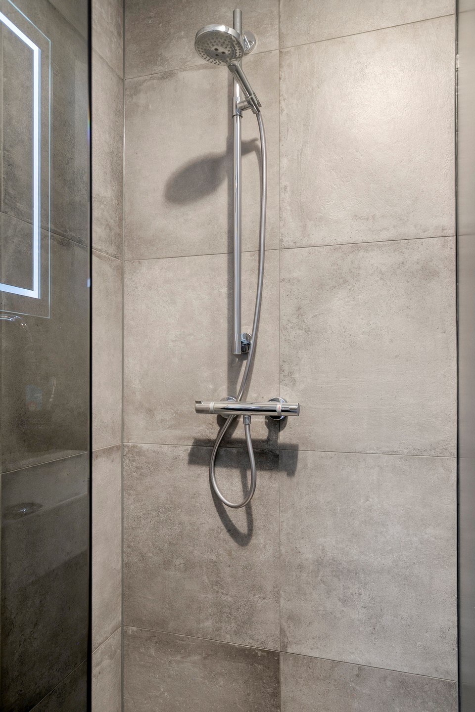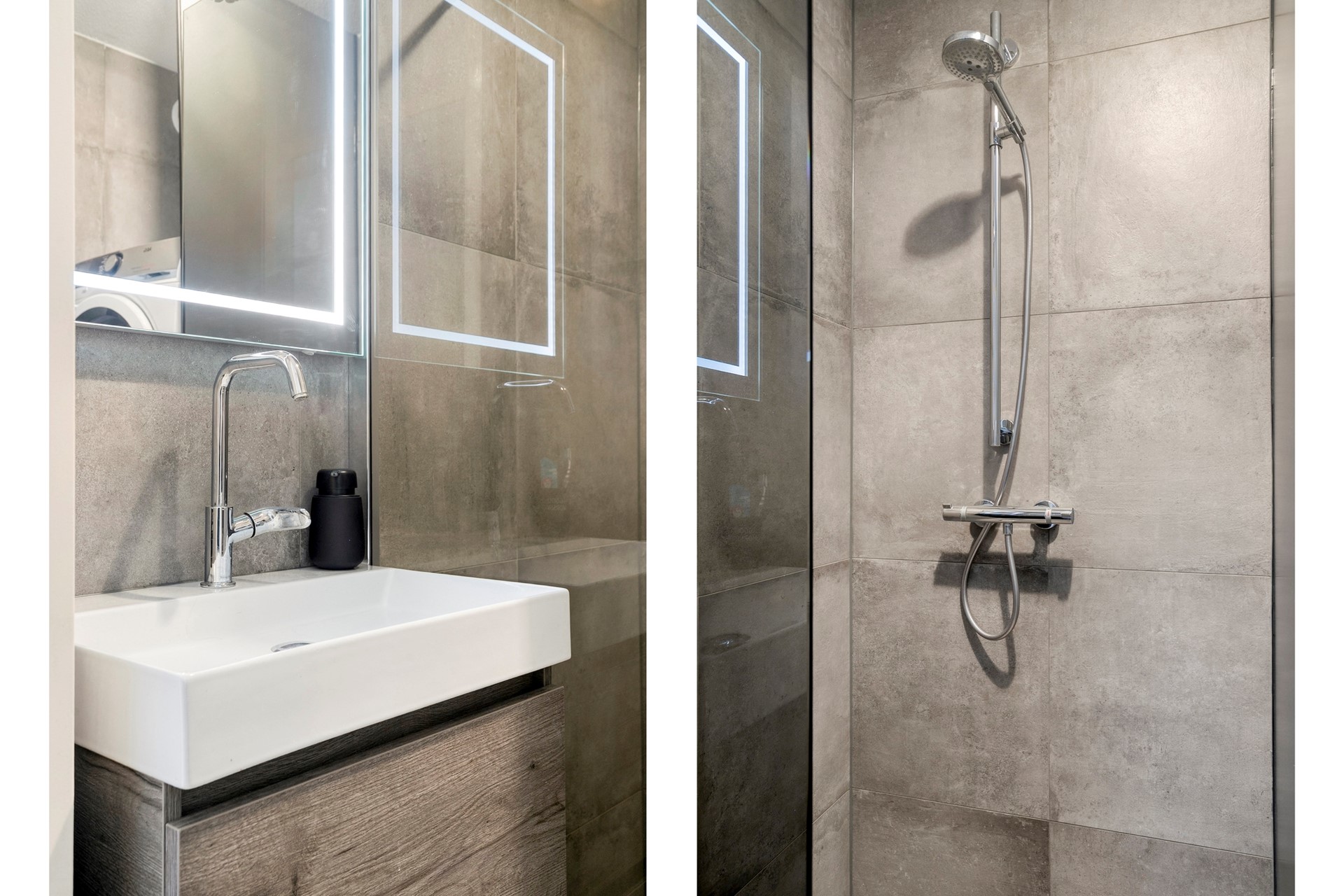 De badkamer is volledig vernieuwd in 2023 en voorzien van een moderne douche, wastafelmeubel, radiator en frisse wand- en vloertegels.
