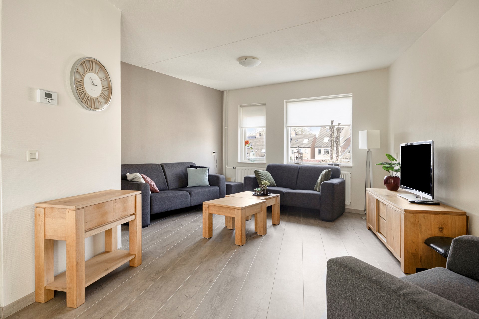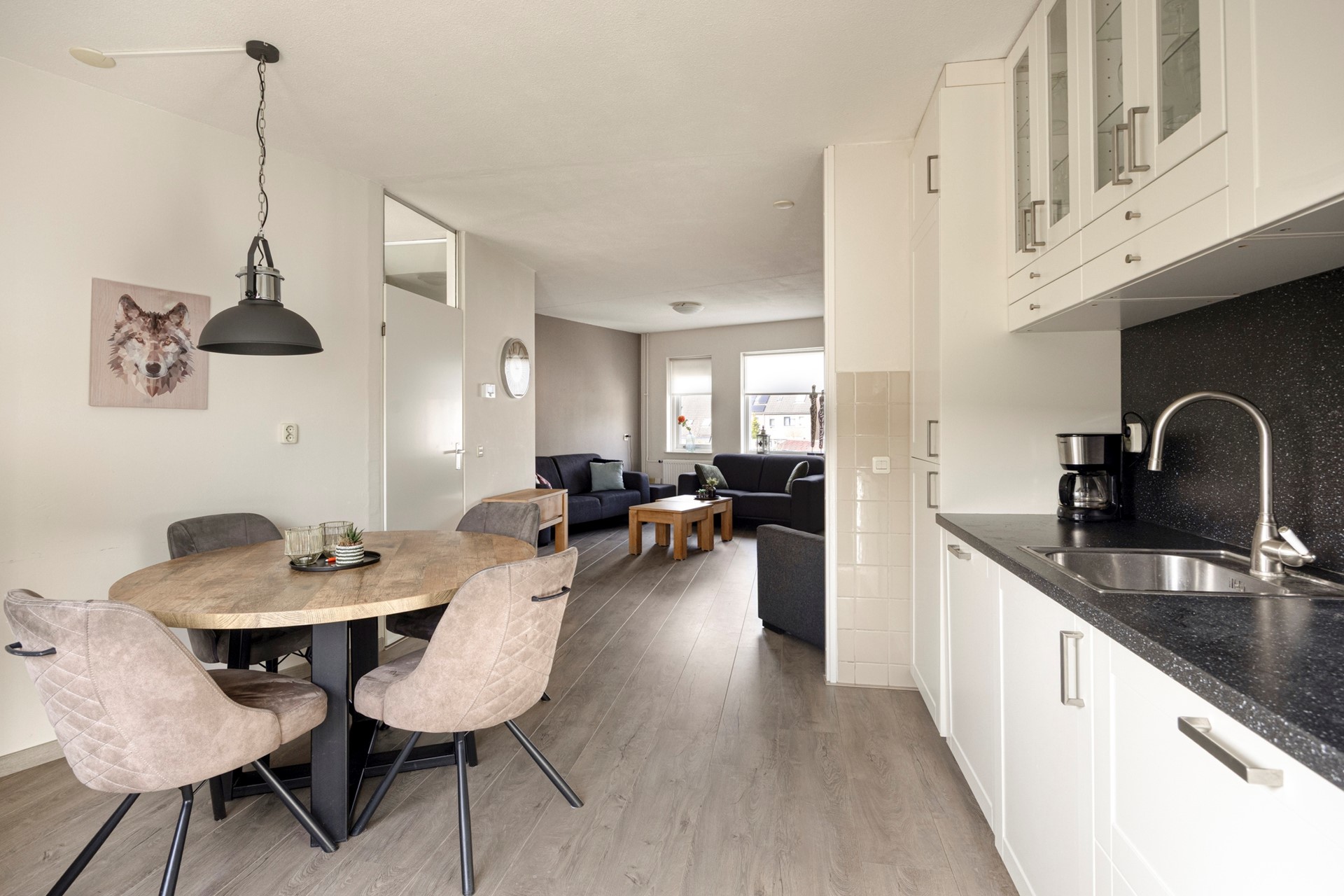 De eerste verdieping vormt het hart van de woning. Hier bevindt zich de lichte woonkamer met open keuken. Dankzij de grote ramen aan de voorzijde valt er veel daglicht binnen, wat zorgt voor een prettige en open sfeer.