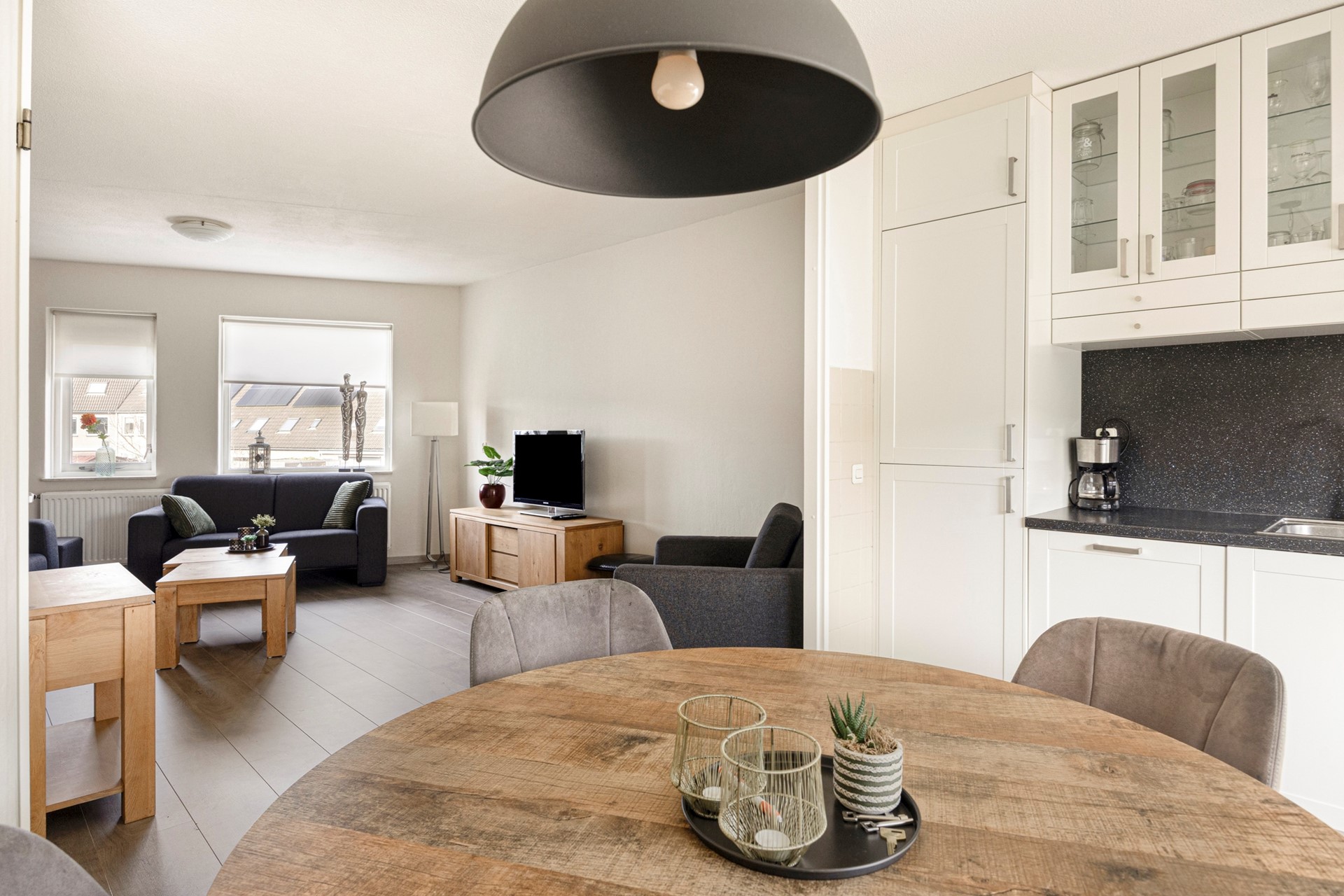 De woonkamer biedt voldoende ruimte voor zowel een comfortabele zithoek als een eethoek. De keuken is in een rechte opstelling geplaatst en voorzien van diverse inbouwapparatuur.