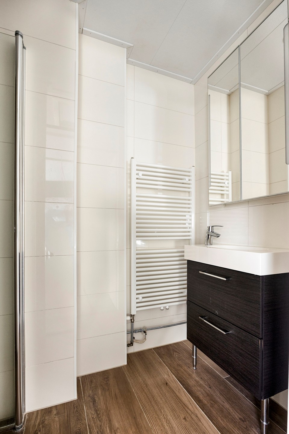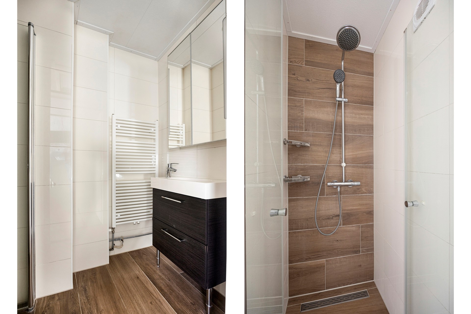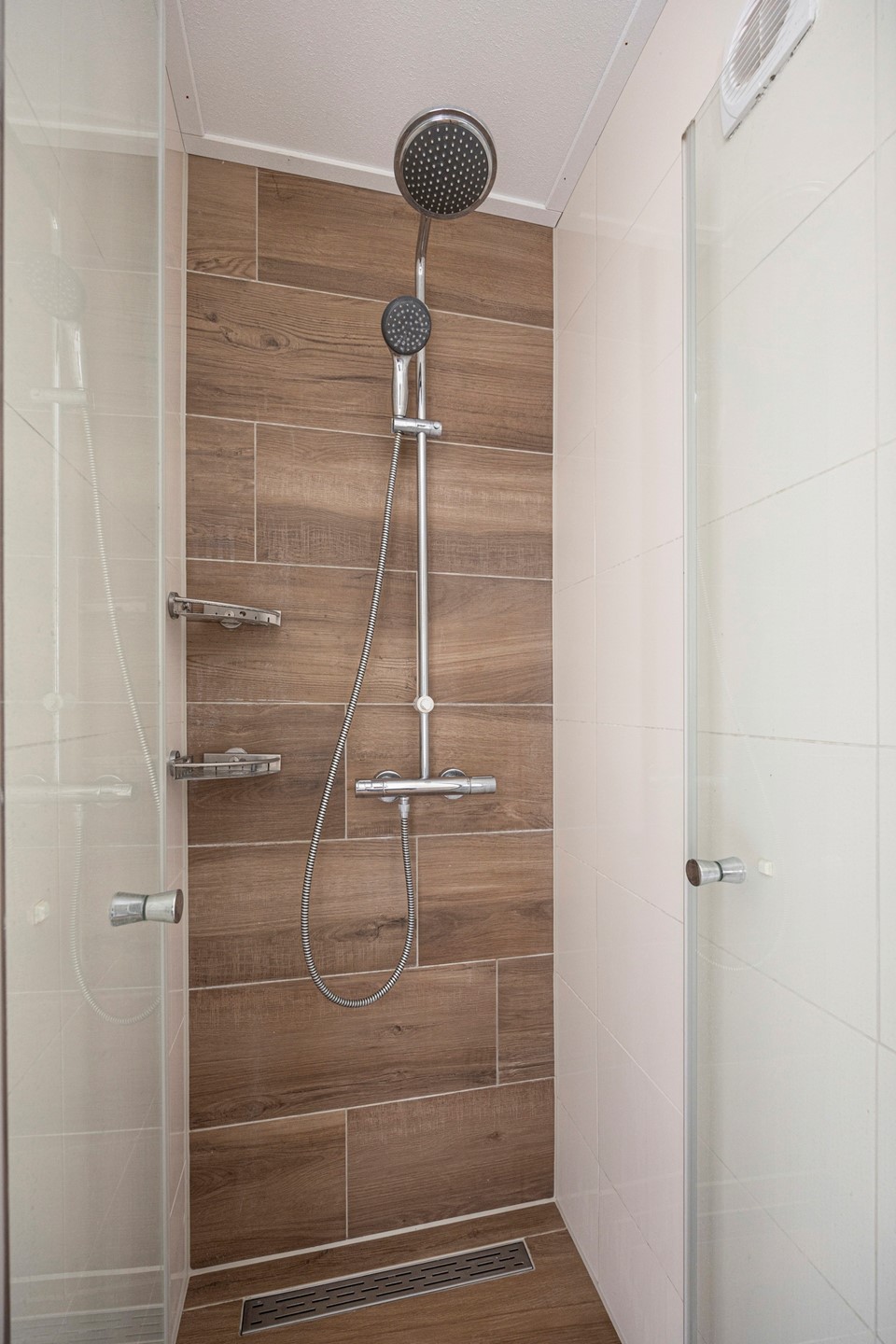 De badkamer is voorzien van een douche, wastafel en sanitaire voorzieningen.